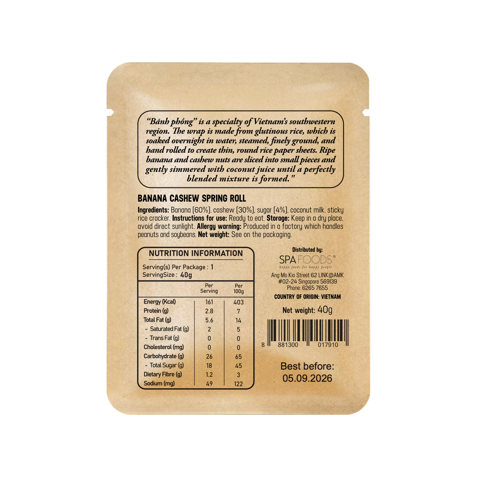 These spring rolls are made with a special wrap (bánh phồng) from Vietnam's southwestern region. The wrap is made from glutinous rice, which is soaked overnight in water, steamed, finely ground, and hand rolled to create thin, round vice paper sheets. Ripe banana and cashew nuts are sliced into small pieces and gently simmered with coconut juice until a perfectly blended mixture is formed.