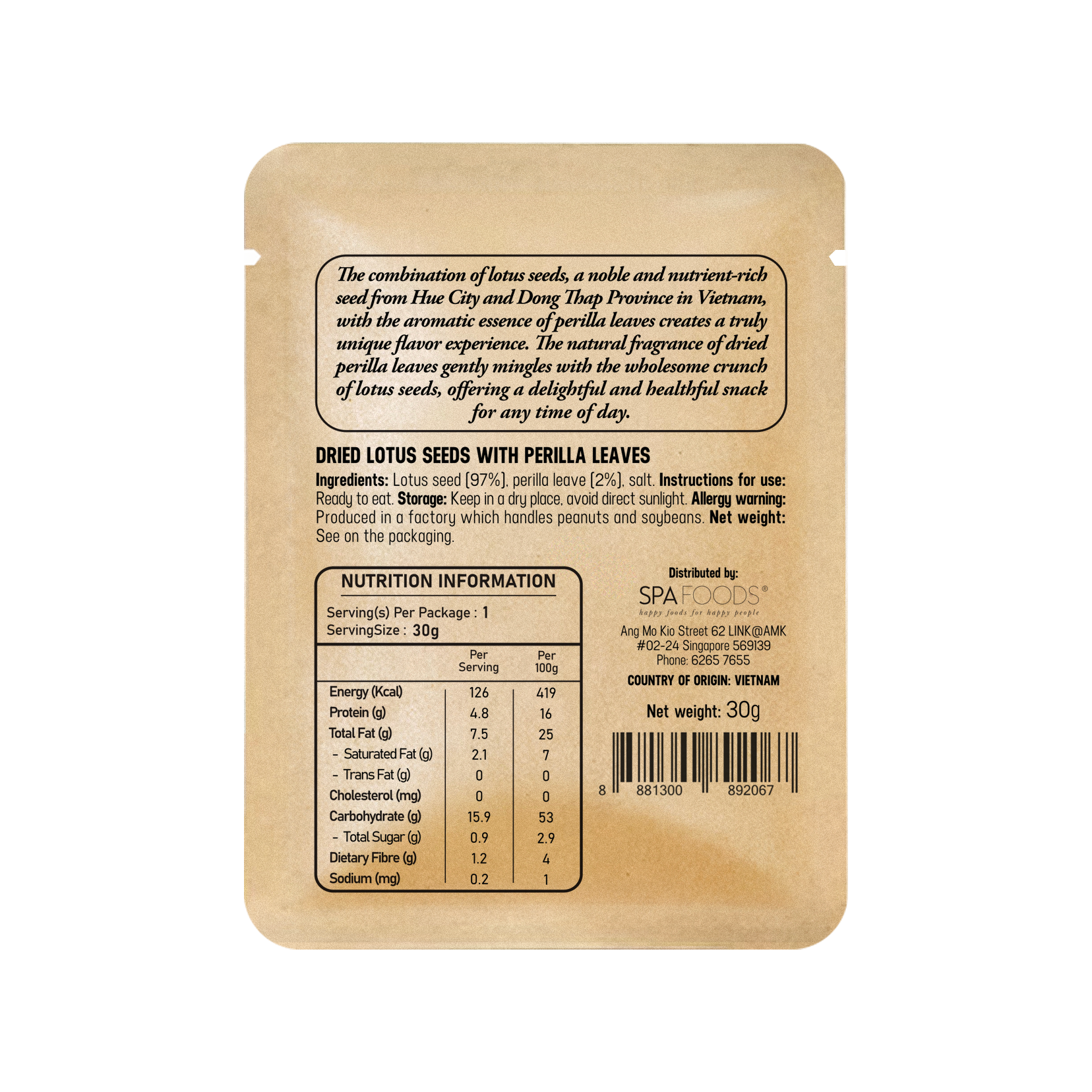 Ingredients: Lotus seed (97%), perilla leaves (2%), salt.