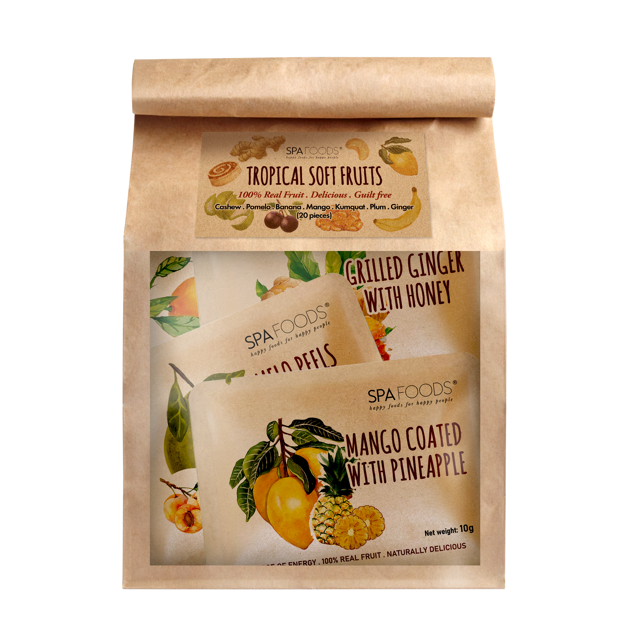 This mixed pack (of 20 sachets) contains a harmony of Cashew, Pomelo Peel, Banana, Mango, Kumquat, Plum and Ginger, all prepped and ready for you to snack enjoyably.