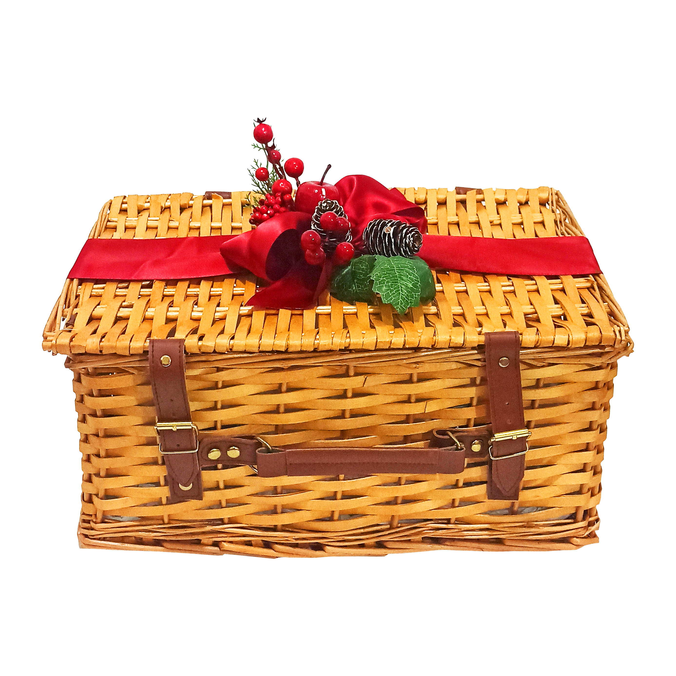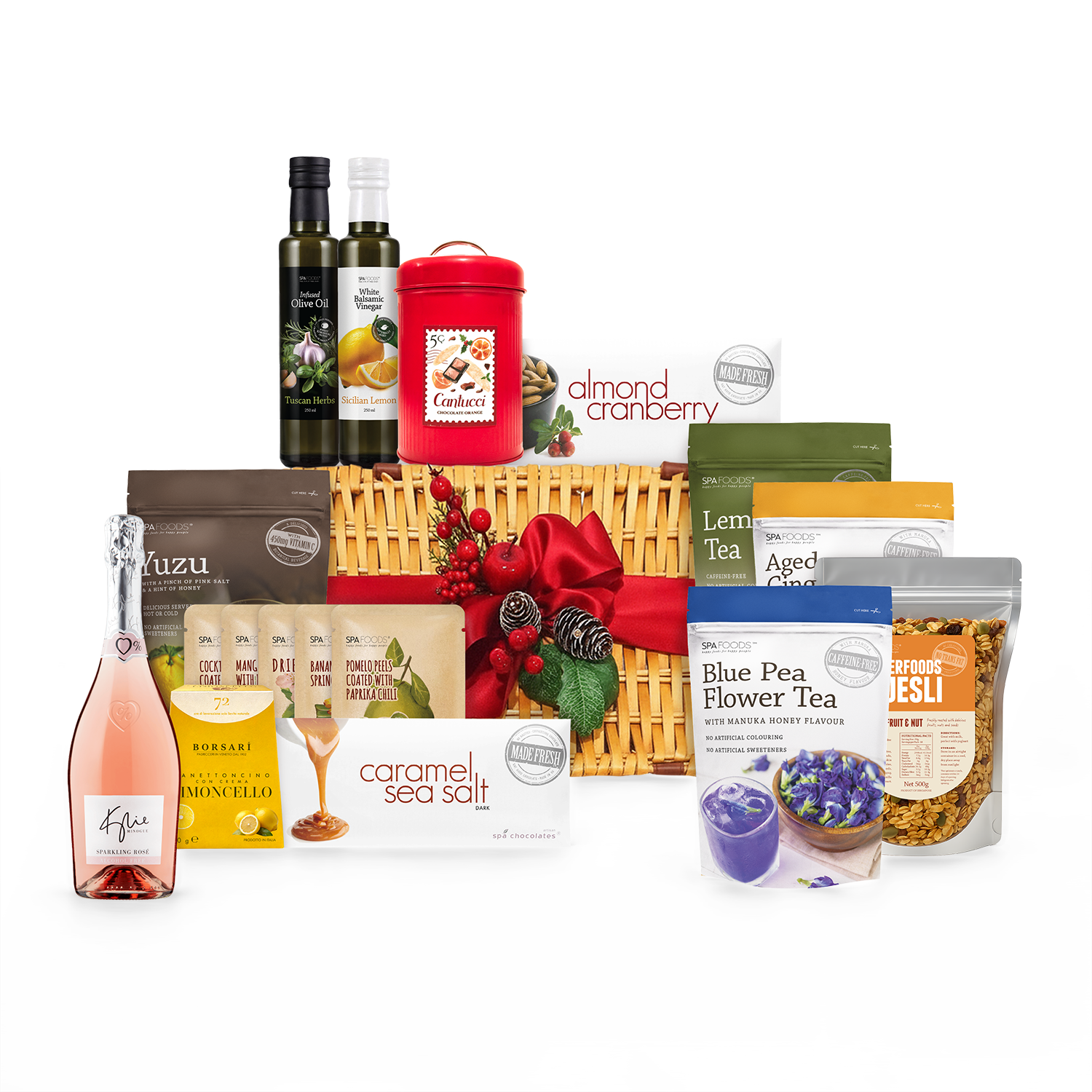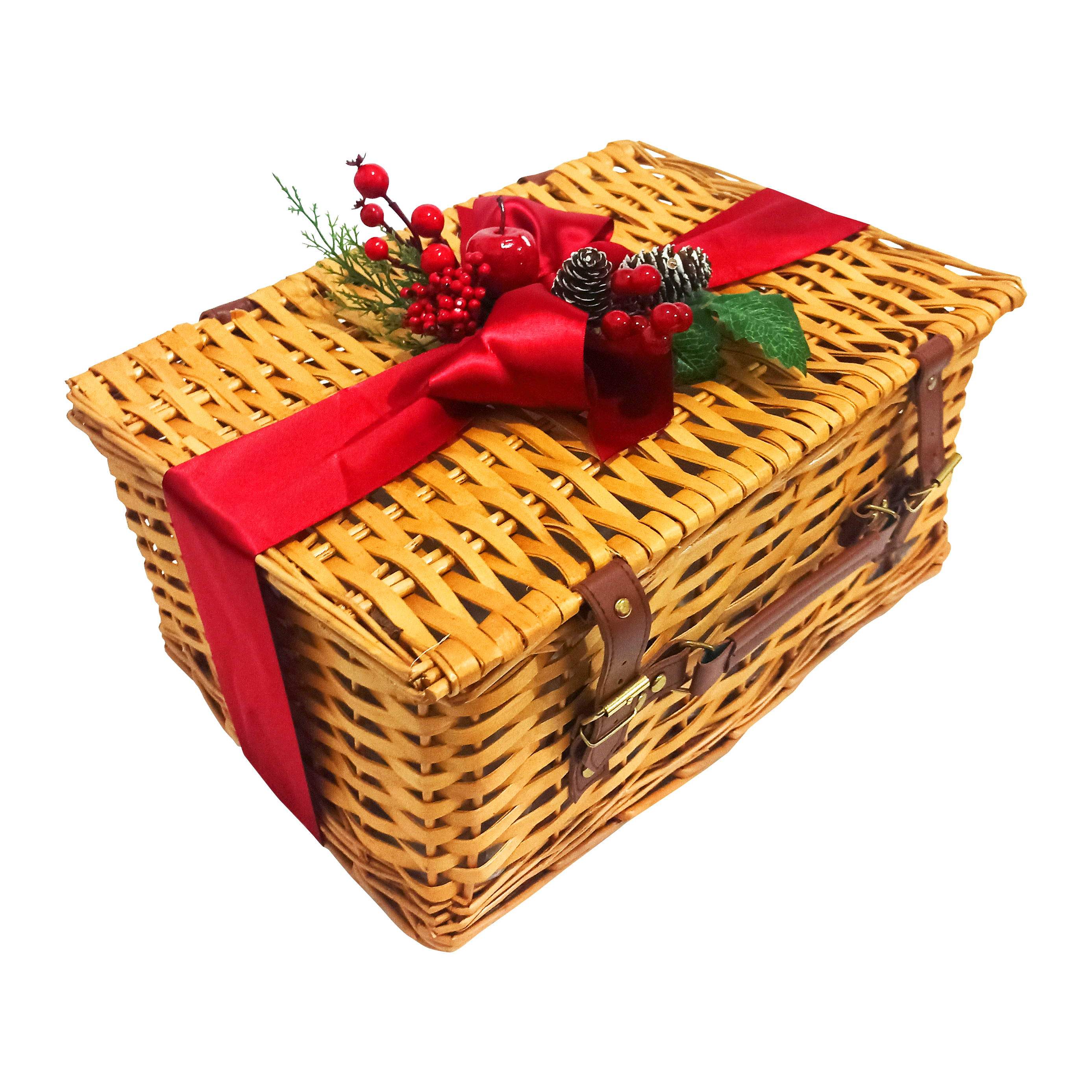 Packed in a basket with satin ribbon, embellishment and gift tag